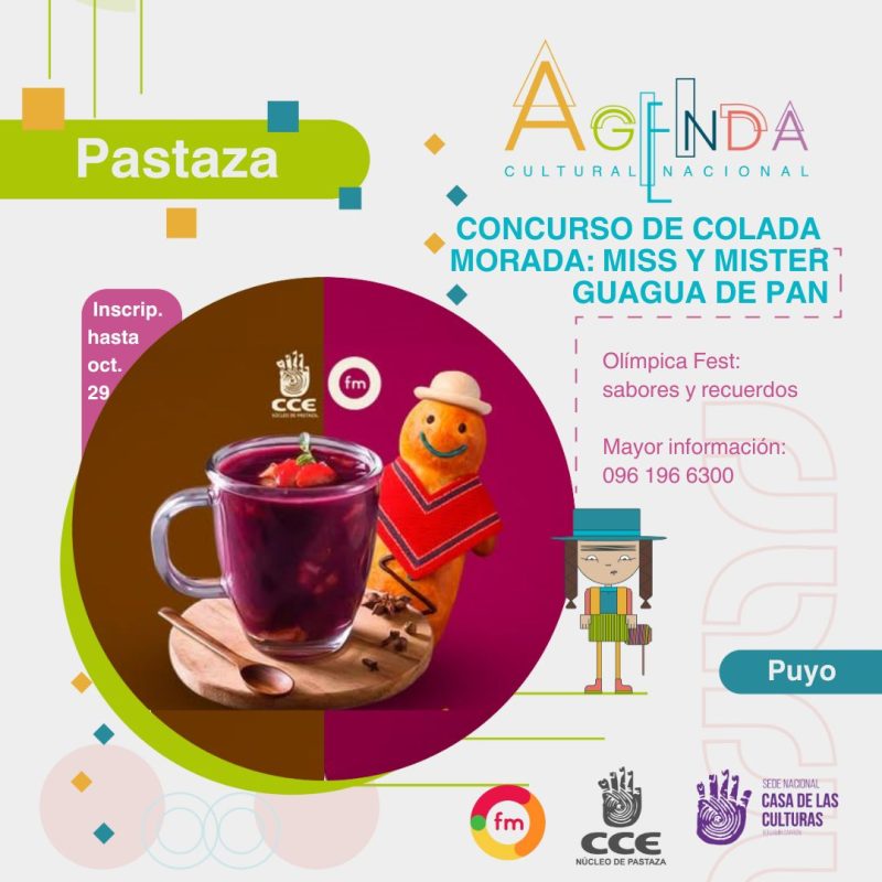 Prepárate para el Olímpica Fest Sabores y recuerdos 2da edición!¡Este jueves 30 de octubre en la ciudad de Puyo, vamos a vivir una jornada llena de sabor, diversión y premios! ¡Ven y participa en la elección de la colada morada más rica! ¡Y la elección de la miss y el míster guagua de pan!Inscripciones abiertas hasta el 29 de octubre Más información 096 196 6300Con el auspicio de la @Cce Núcleo De Pastaza